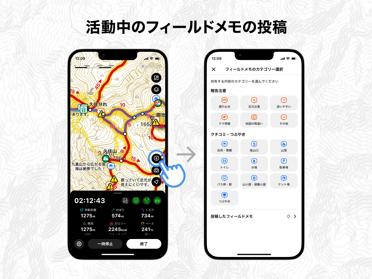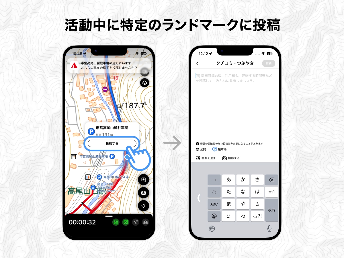 - 活動中、地図上のランドマーク(登山口・駐車場・山頂など)をタップすると、「投稿」ボタンが表示されるようになりました。