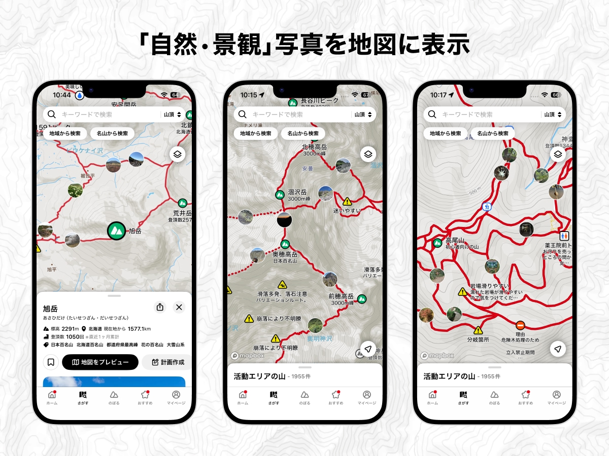 - 山選びや散策ルートの発見に、「あ、あそこ行きたい!」がよりリアルに。
