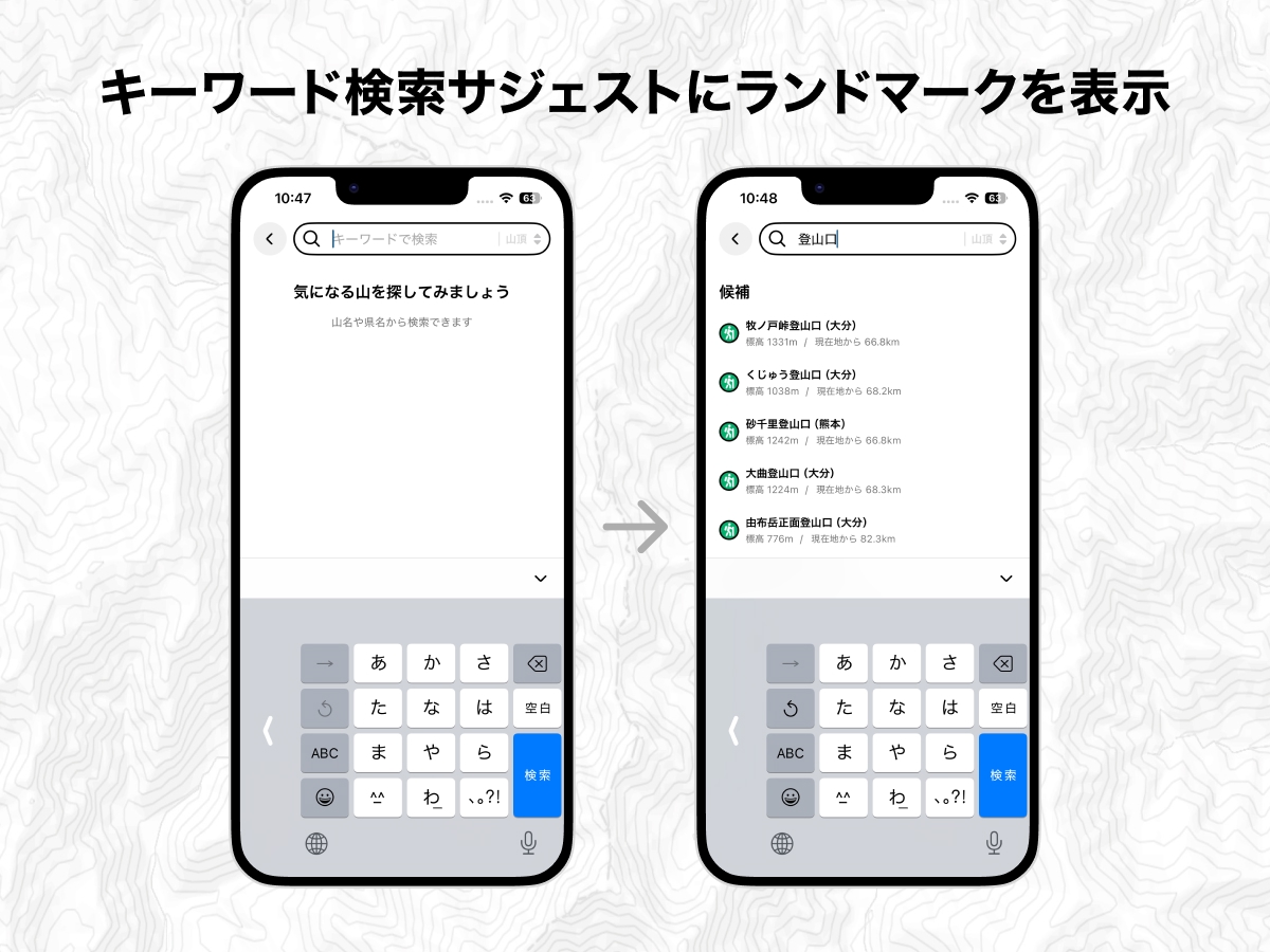 - さがすタブのキーワード検索で「登山口」「駐車場」「展望台」などのランドマークがサジェストとして表示されるようになりました。