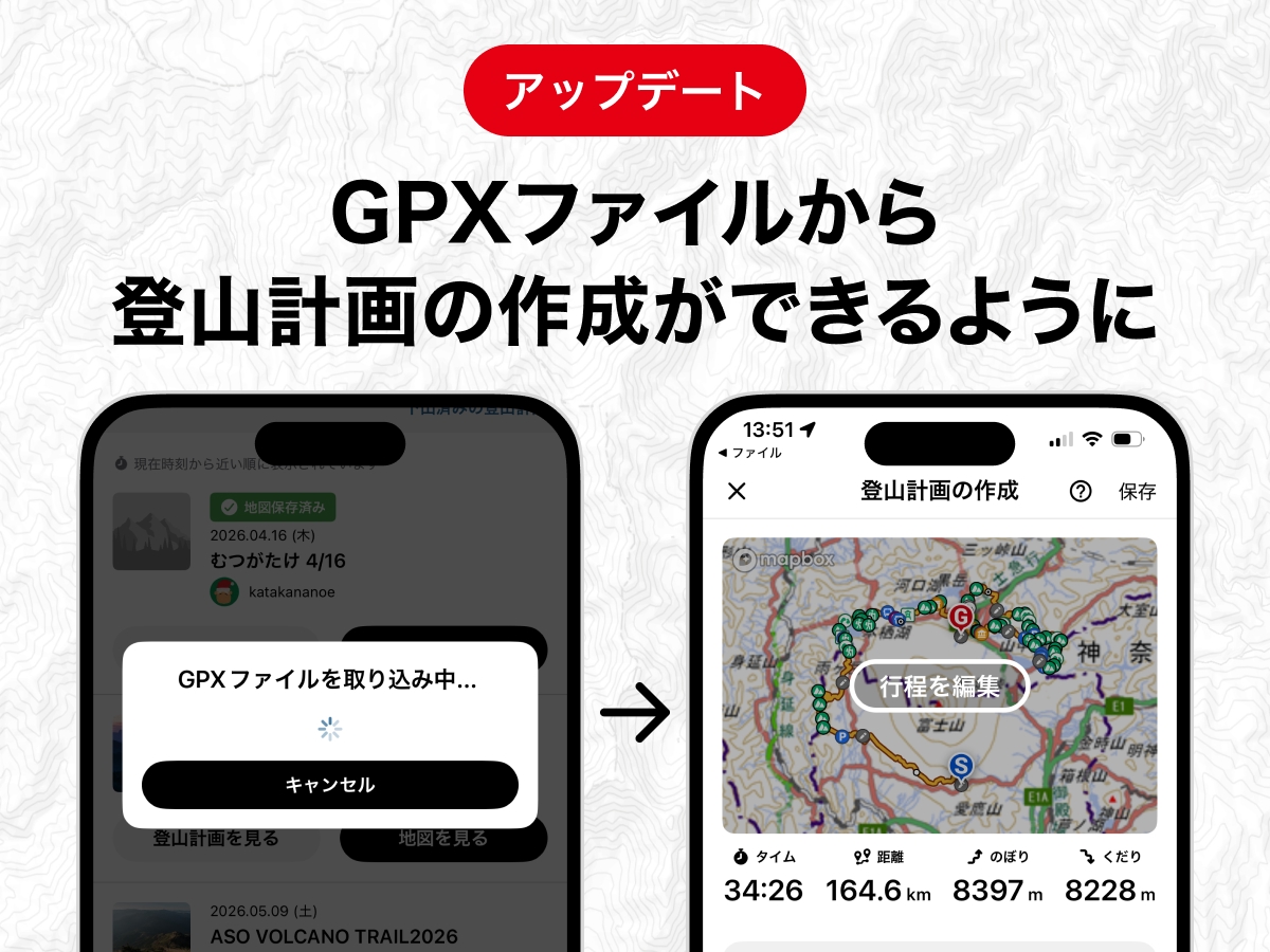 この度「外でもらったルートデータを、そのままYAMAPの計画に使いたい」というみなさんの声にお応えして、GPXファイルを読み込んで、そのまま登山計画がつくれる新機能が登場しました。