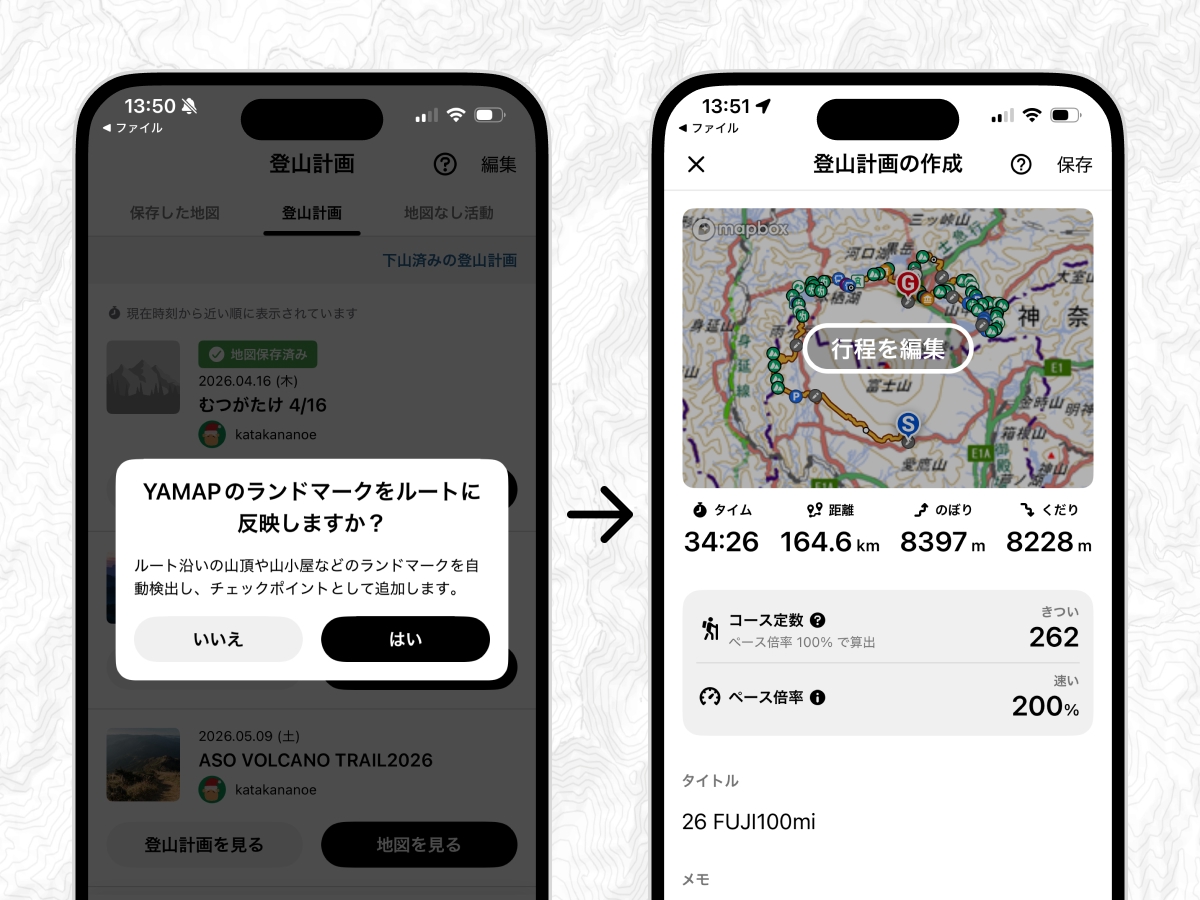 自動的にYAMAPが立ち上がり、登山計画が作成されます。