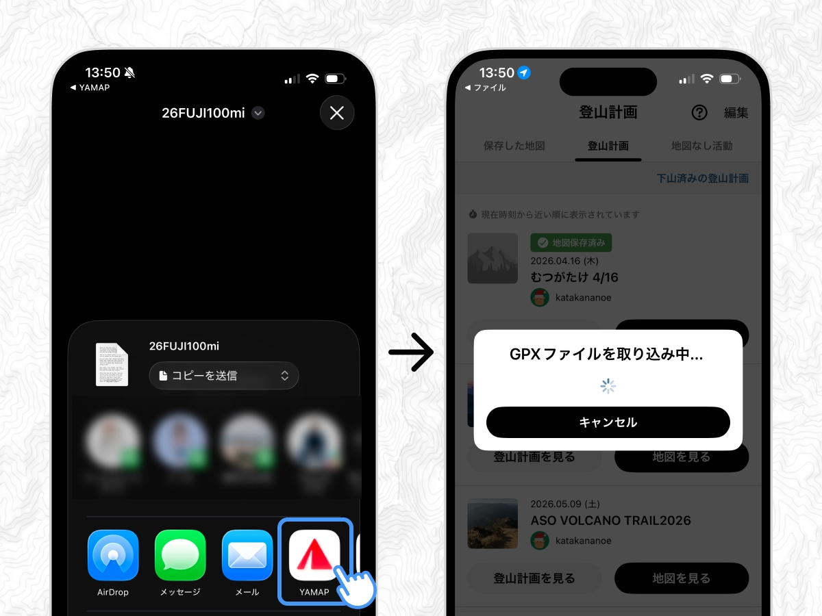 スマートフォンにあるGPXファイルを開きます。